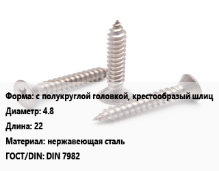 Саморез с полукруглой головкой, крестообразый шлиц D=4.8 L=22 нержавеющая сталь ГОСТ: DIN 7982