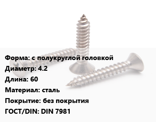 Саморез с полукруглой головкой D=4.2 L=60 сталь без покрытия ГОСТ: DIN 7981, шт цена По запросу где купить, условия доставки в Новосибирске и Новосибирской области