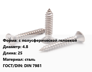 Саморез с полусферической головкой D=4.8 L=25 сталь ГОСТ: DIN 7981