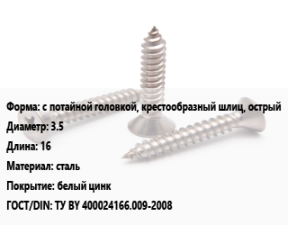 Саморез с потайной головкой, крестообразный шлиц, острый D=3.5 L=16 сталь белый цинк ГОСТ: ТУ BY 400024166.009-2008