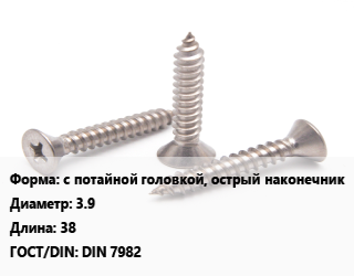 Саморез с потайной головкой, острый наконечник D=3.9 L=38 ГОСТ: DIN 7982, шт цена от 2.25 ₽ / кг, где купить, условия доставки в Новосибирске и Новосибирской области
