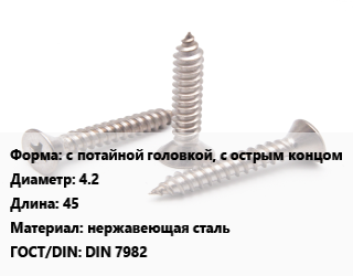 Саморез с потайной головкой, с острым концом D=4.2 L=45 нержавеющая сталь ГОСТ: DIN 7982