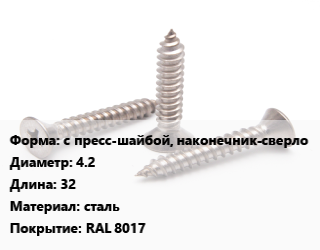 Саморез с пресс-шайбой, наконечник-сверло D=4.2 L=32 сталь RAL 8017, шт цена По запросу где купить, условия доставки в Новосибирске и Новосибирской области