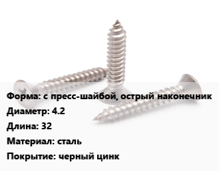 Саморез с пресс-шайбой, острый наконечник D=4.2 L=32 сталь черный цинк, кг цена от 216.99 ₽ / кг, где купить, условия доставки в Новосибирске и Новосибирской области