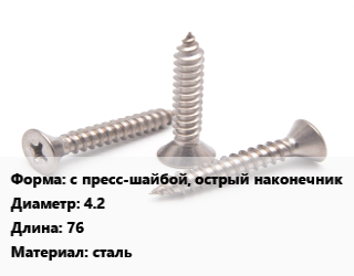 Саморез с пресс-шайбой, острый наконечник D=4.2 L=76 сталь, кг, для металла цена от 259.69 ₽ / кг, где купить, условия доставки в Новосибирске и Новосибирской области