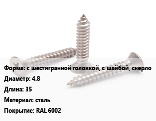 Саморез с шестигранной головкой, с шайбой, сверло D=4.8 L=35 сталь RAL 6002, упаковка 1000 шт, с резиновой прокладкой цена от 1 692 ₽ / кг, где купить, условия доставки в Новосибирске и Новосибирской области