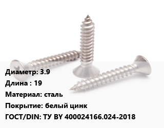 Саморез 3.9 L=19 сталь белый цинк ГОСТ: ТУ BY 400024166.024-2018