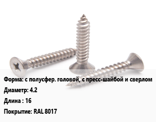 Саморез с полусфер. головой, с пресс-шайбой и сверлом D=4.2 L=16 RAL 8017, упаковка 50 шт цена от 25.52 ₽ / кг, где купить, условия доставки в Новосибирске и Новосибирской области