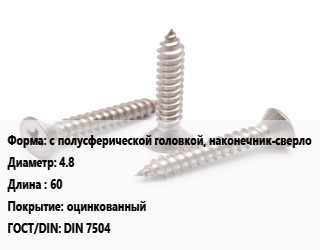 Саморез с полусферической головкой, наконечник-сверло D=4.8 L=60 оцинкованный ГОСТ: DIN 7504, шт, форма N цена от 4.9 ₽ / кг, где купить, условия доставки в Новосибирске и Новосибирской области