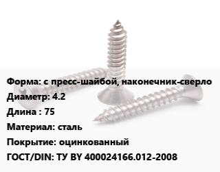 Саморез с пресс-шайбой, наконечник-сверло D=4.2 L=75 сталь оцинкованный ГОСТ: ТУ BY 400024166.012-2008, упаковка 1000 шт, РМЗ цена от 1 331 ₽ / кг, где купить, условия доставки в Новосибирске и Новосибирской области