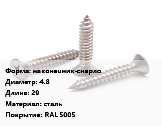 Саморез наконечник-сверло D=4.8 L=29 сталь RAL 5005, упаковка 1000 шт цена от 1 881 ₽ / кг, где купить, условия доставки в Новосибирске и Новосибирской области