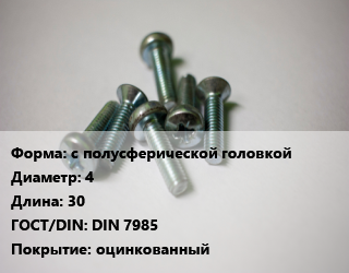 Винт с полусферической головкой 4х30 DIN 7985 оцинкованный, цена за 1000 шт,цена за шт, кг цена от 378.54 ₽ / кг, где купить, условия доставки в Новосибирске и Новосибирской области