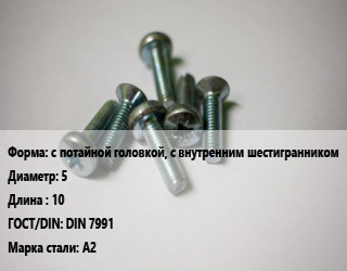 Винт с потайной головкой, с внутренним шестигранником 5х10 DIN 7991 Сталь: A2, по запросу, кг цена от 28.35 ₽ / кг, где купить, условия доставки в Новосибирске и Новосибирской области