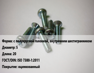 Винт с полукруглой головкой, внутренним шестигранником 5х20 ISO 7380-1:2011 оцинкованный, 10.9, цена за шт, кг цена По запросу где купить, условия доставки в Новосибирске и Новосибирской области