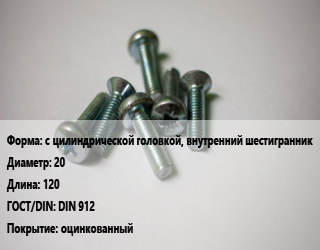 Винт с цилиндрической головкой, внутренний шестигранник 20х120 DIN 912 оцинкованный, 8.8, цена за 1000 шт, кг цена от 289.3 ₽ / кг, где купить, условия доставки в Новосибирске и Новосибирской области