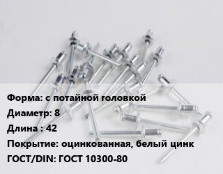 Заклепка с потайной головкой 8х42 оцинкованная, белый цинк ГОСТ: ГОСТ 10300-80