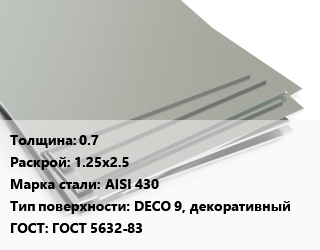 Лист нержавеющий 0.7 1.25х2.5 Сталь: AISI 430 Тип:DECO 9, декоративный ГОСТ 5632-83 цена от 398 650 ₽ / т, где купить, условия доставки в Новосибирске и Новосибирской области