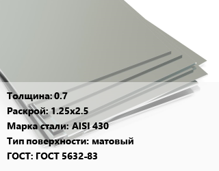 Лист нержавеющий 0.7 1.25х2.5 Сталь: AISI 430 Тип:матовый ГОСТ 5632-83, шт, х/к цена от 3 713 ₽ / т, где купить, условия доставки в Новосибирске и Новосибирской области