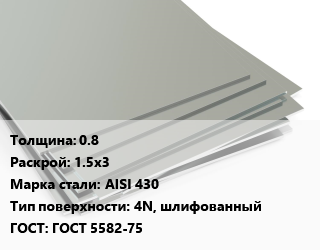 Лист нержавеющий 0.8 1.5х3 Сталь: AISI 430 Тип:4N, шлифованный ГОСТ 5582-75