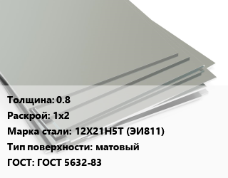 Лист нержавеющий 0.8 1х2 Сталь: 12Х21Н5Т (ЭИ811) Тип:матовый ГОСТ 5632-83