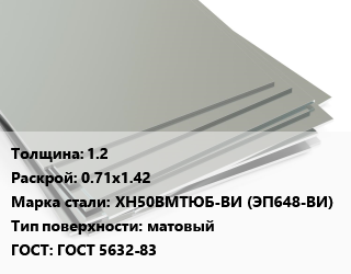Лист нержавеющий 1.2 0.71х1.42 Сталь: ХН50ВМТЮБ-ВИ (ЭП648-ВИ) Тип:матовый ГОСТ 5632-83