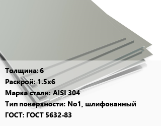 Лист нержавеющий 6 1.5х6 Сталь: AISI 304 Тип:No1, шлифованный ГОСТ 5632-83